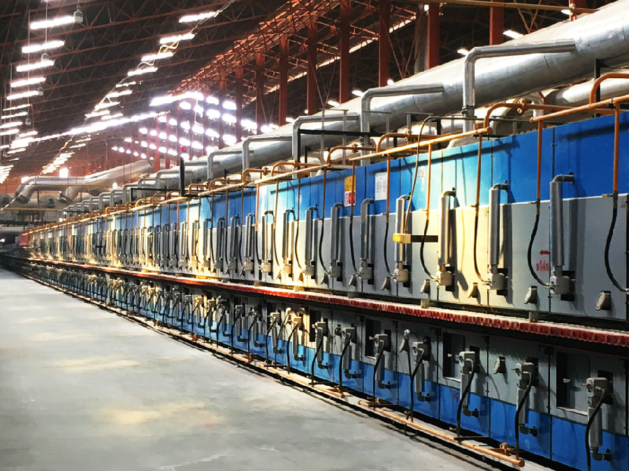The firing department ofproduction line is composed of a DGK innovated energy-saving wide-body kiln, aDHD-EM4 self-circulating dryer and a prekiln dryer, boasting the latesttechnologies of LT Brand, such as DHR Heat Recovery System, KHI UpdatedInsulation System for Kiln, PPC Super Energy-saving Combustion System, etc.Thanks to the improved air-gas ratio control program and the independentlyadjustable combustion air pipeline design, the new technologies can effectivelyreduce fuel consumption as to save gas by 3% ~ 5% compared with normal systems.The intelligent automatic control stabilizes the firing temperatures andminimizes the temperature variation inside the kiln, hence guarantees andmaintains the qualified product rate effectively. -