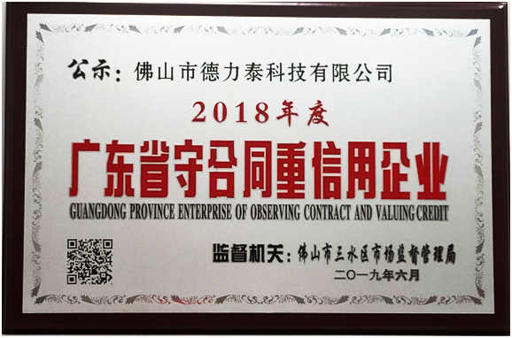在當(dāng)前深化社會經(jīng)濟體制改革,應(yīng)對國際金融危機、促進社會經(jīng)濟可持續(xù)發(fā)展的新形勢下,德力泰依然初心不改,砥礪前行,不但順應(yīng)時代發(fā)展潮流,不斷加大科研創(chuàng)新驅(qū)動,不斷刷新行業(yè)的創(chuàng)新技術(shù)和研發(fā)成果,以單機和陶機整線工程博擊全球市場,是一個眾多陶企青睞和政府部門肯定的、科技領(lǐng)先具有全球競爭力的陶機旗艦企業(yè),并受競爭者尊敬的企業(yè),更是一個非常注重合同和信用管理體系建設(shè)的企業(yè)。嚴(yán)格遵循“守合同、重信用”的相關(guān)規(guī)定,且對營造誠信經(jīng)營的良好市場環(huán)境樹立了榜樣形象,并于近日,收到了佛山市三水區(qū)市場監(jiān)督管理局頒發(fā)的“2018年度廣東省‘守合同重信用’企業(yè)”證書和授予的牌匾。