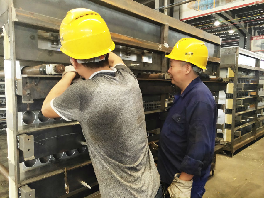 室外驕陽似火,酷暑難當,安裝現場的車間環境也變得格外悶熱異常,撲面而來的熱浪讓廠房內的溫度高達40多度,技術人員在高溫之下依然辛勤勞作,大汗淋漓,衣服濕透也絲毫不懈怠。為了讓每個工序正常有序的運行,依然有條不紊地進行著標準操作,一干就是幾個小時。為保證項目安裝與調試工作順利完成、保證后續生產穩定運行,他們挑戰酷暑,鼓足干勁。心無旁騖,汗水就是他們的勛章;猶如蒸籠,熱氣逼人的車間就是他們的戰場?!案伞弊之旑^,技術員們用兢兢業業的精神譜寫著一曲曲愛崗敬業的贊歌。