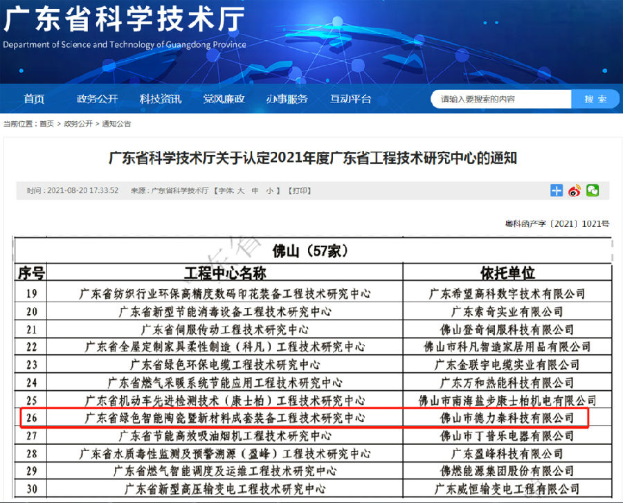 為深入實施創新驅動發展戰略,加強企業研發機構建設,有力支撐戰略性產業集群發展,根據廣東省科學技術廳專家評審和網上公示,在8月20日發布的“廣東省科學技術廳關于認定2021年度廣東省工程技術研究中心的通知”中,德力泰組建的“廣東省綠色智能陶瓷暨新材料成套裝備工程技術研究中心”順利通過了認定。