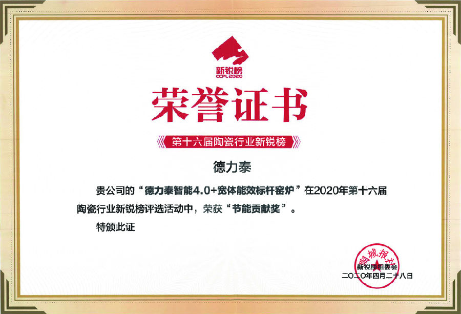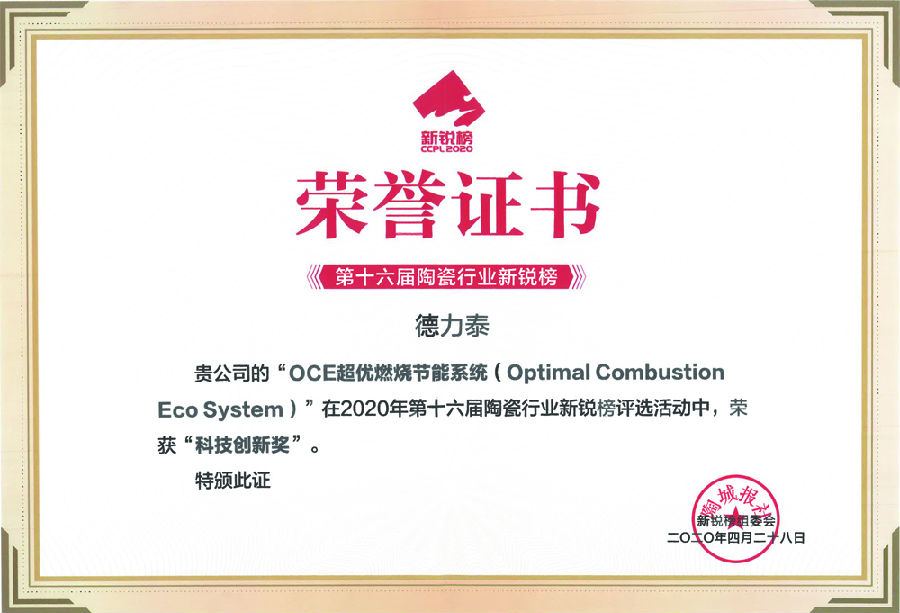 力泰品牌憑借以堅持精耕高技術、低能耗、環境友好的高品質供給,以有競爭優勢的自動化、智能化、信息化整線堅持國際化運作而實力凸顯。恒力泰“HT36000型超大規格陶瓷板智能成型成套裝備”獲《科技創新獎》;德力泰“OCE超優燃燒節能系統”獲《科技創新獎》、“智能4.0+寬體能效標桿窯爐”獲《節能貢獻獎》。熠熠星光,載譽而歸!