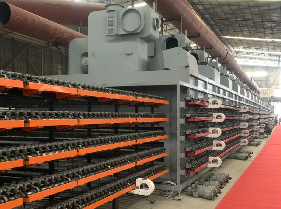 H2#生產線是條定位高端、技術領先的巖板生產線。配備恒力泰一臺YP16890自動液壓機、德力泰一條“4.0能效標桿數智時代”高端寬體燒成窯、一條高效自循環五層干燥器及前噴墨后釉線干燥器、后噴墨后釉線干燥器、窯前釉線干燥器、窯前自循環干燥器等設備。