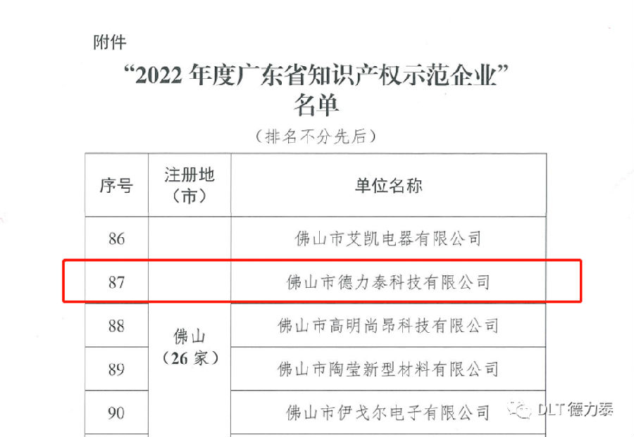 經過企業申報、資料審查(含數據檢索)、網絡系統評分、知識產權局推薦、專家評審等程序,廣東省知識產權保護協會于近日公布了“2022年度廣東省知識產權示范企業”認定結果,佛山市德力泰科技有限公司位列其中。