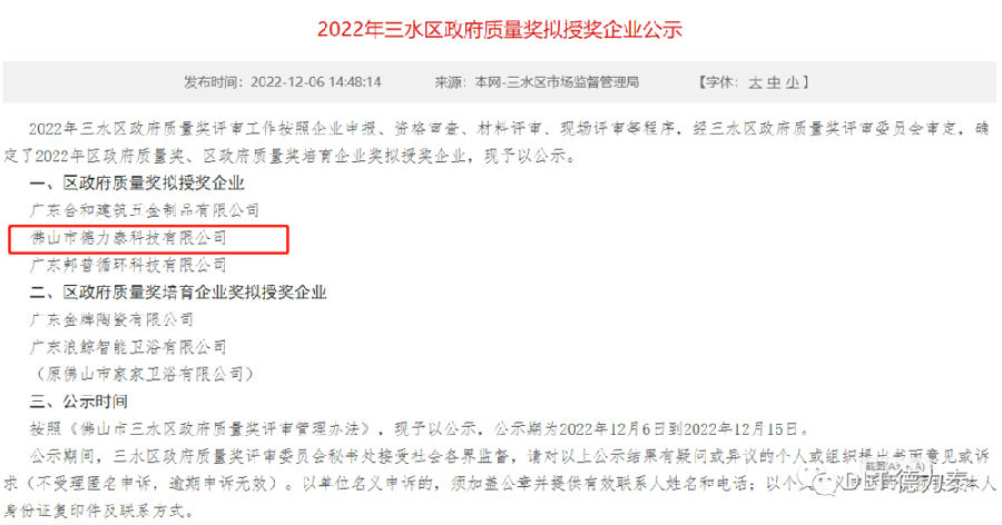 與此同時,在經過企業申報、資格審查、材料評審、專家組現場評審、答辯等程序,三水區政府質量獎評審委員會秘書處于近日公示了“2022年三水區政府質量獎”的獲獎企業,其中2022年區政府質量獎3家、區政府質量獎培育企業獎2家,佛山市德力泰科技有限公司獲政府質量獎。