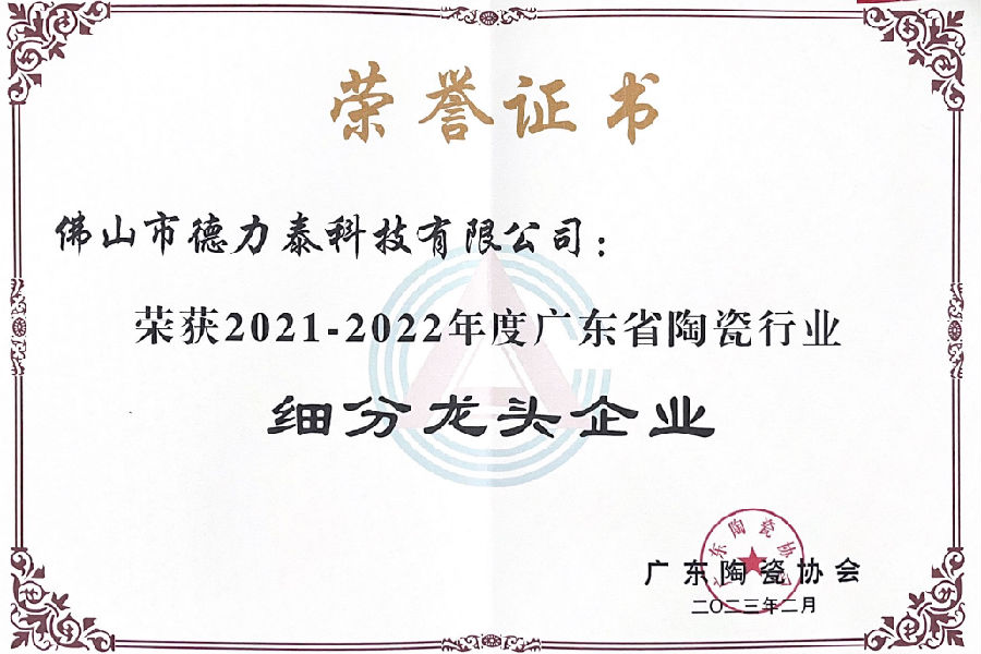 近年來,德力泰先后獲得了佛山市“專精特新”企業(yè)、廣東省專精特新中小企業(yè)、佛山市細分行業(yè)龍頭企業(yè)、廣東陶瓷行業(yè)細分龍頭企業(yè)等榮譽,在陶瓷裝備細分領域“專”“精”“特”“新”等方面獨樹一幟。不僅在完善企業(yè)精細化管理、特色自主品牌影響力與市場占有率顯著增強,創(chuàng)新成果也不斷涌現,在關鍵領域產業(yè)鏈中填補了空白。發(fā)展綠色技術,解決了行業(yè)內技術發(fā)展卡脖子難題,多項優(yōu)質產品達到國際先進水平和國內領先水平。其產品不僅用戶滿意,還得到了各級政府部門和行業(yè)協(xié)會的關注與認可。