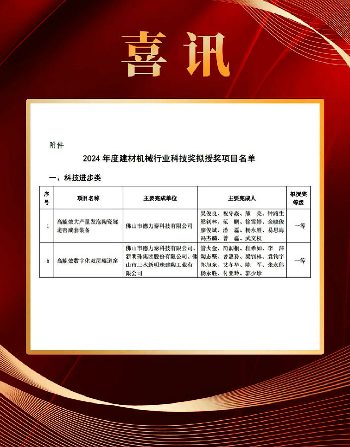 兩個項目分別是德力泰科技自主研發的“高能效大產量發泡陶瓷隧道窯成套裝備”,以及由德力泰科技、新明珠集團和三水新明珠共同研發的“高能效數字化雙層輥道窯”。此次獲獎,既是對德力泰研發創新實力的認可,更為德力泰繼續攻關“高精尖”技術、再攀高峰注入強勁動力!